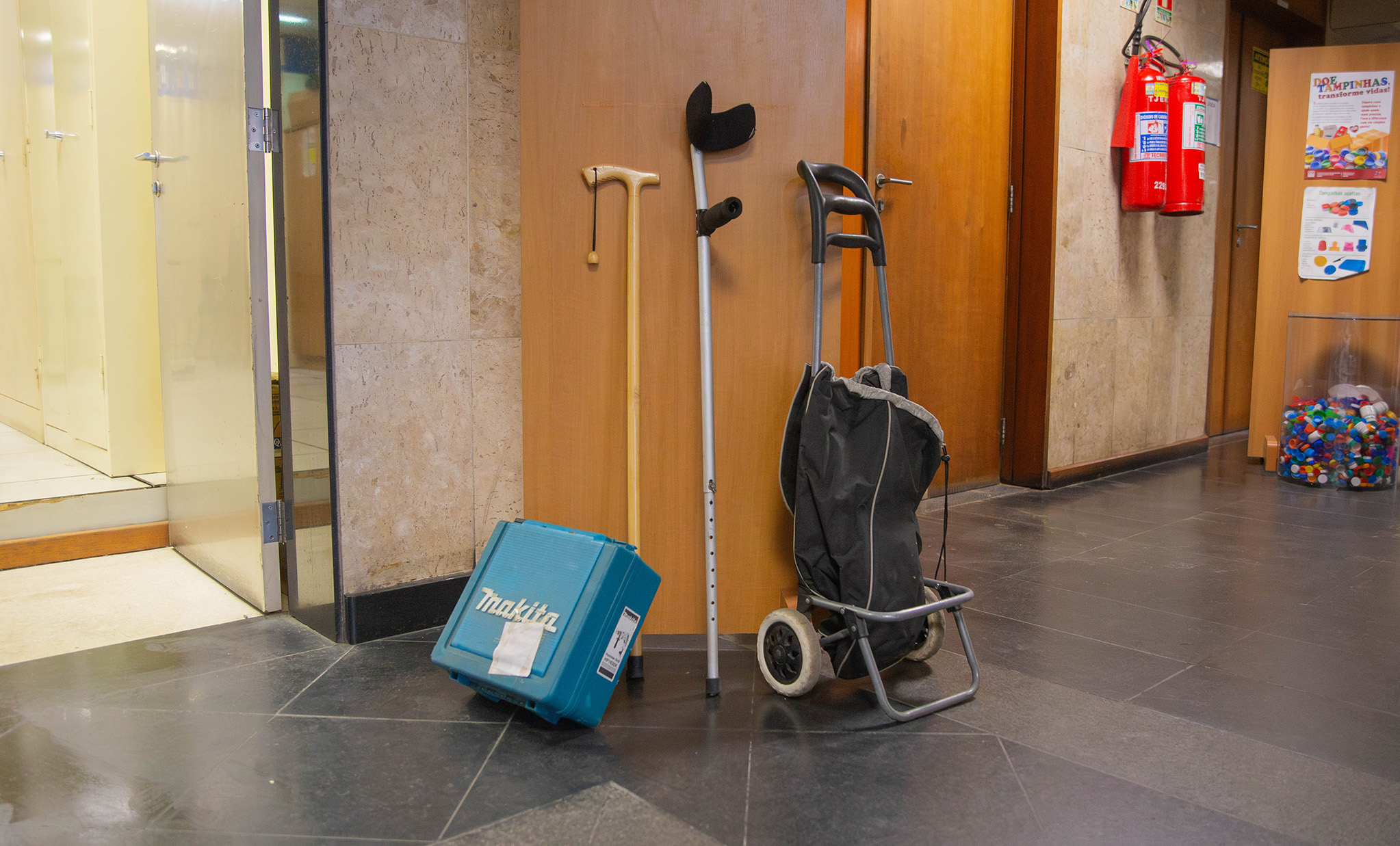 Máquina utilizada em obras, bengala, muleta e carrinho de feira fazem parte do acervo do Setor de Achados e Perdidos do Fórun Central