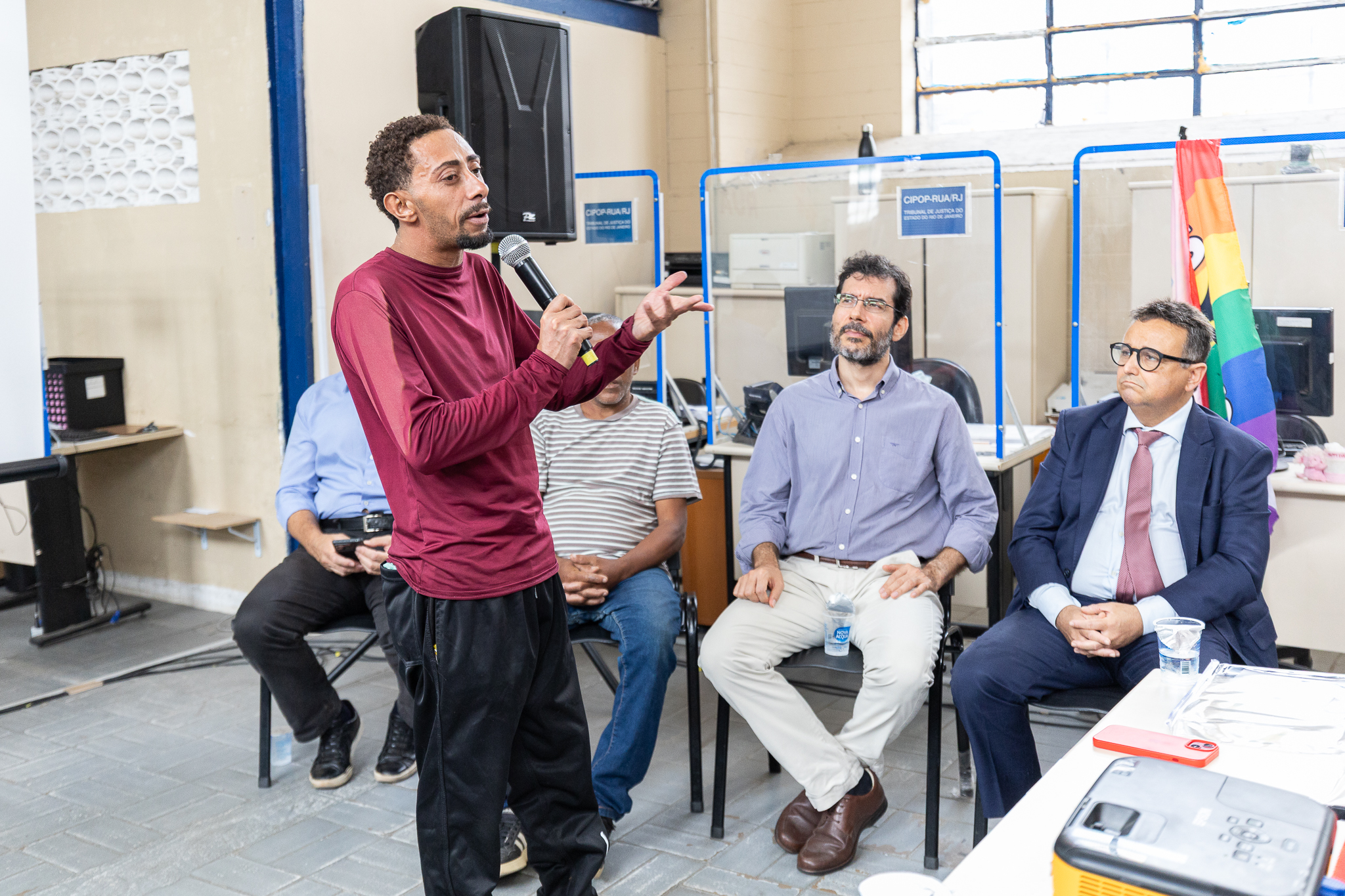 Igor Sardou dos Santos (em pé) fala sobre sua realidade como morador em situação de rua