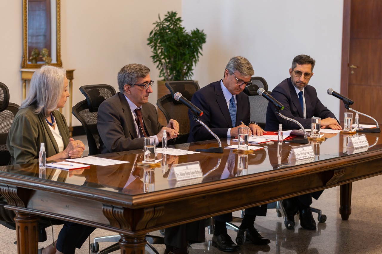 Da esquerda para a direita: a diretora da Faculdade de Direito da Uerj, Heloisa Helena Gomes Barboza; o reitor da Uerj, Mário Sergio Alves Carneiro; o presidente do TJRJ, desembargador Henrique Figueira, assinando o termo do convênio, e o desembargador Cesar Cury