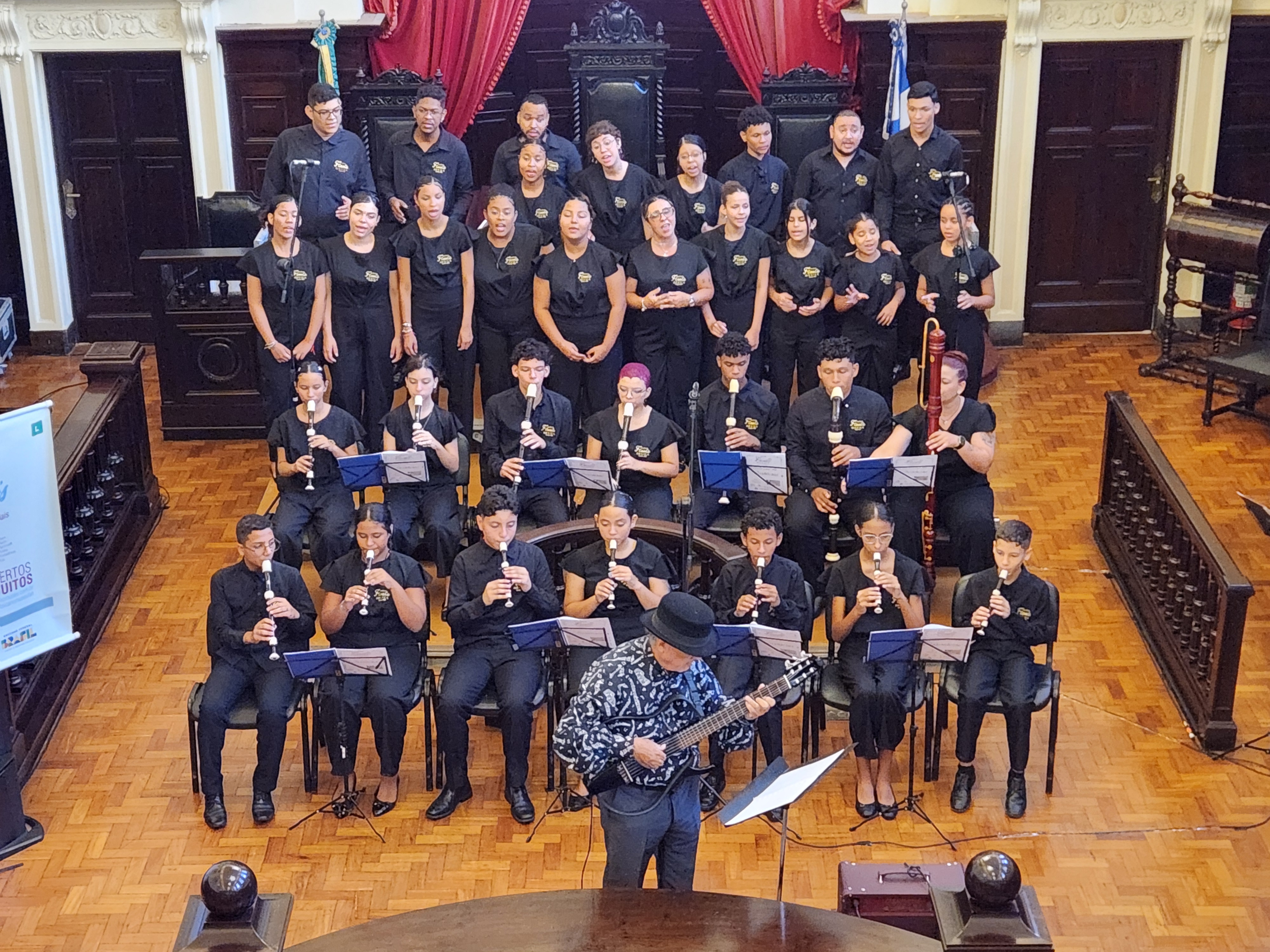 Além das crianças e jovens que compõem a Flauta Mágica, o concerto foi capitaneado pelo maestro e violonista Gilberto Mendes e também incluiu participação de banda com guitarra, baixo e bateria.