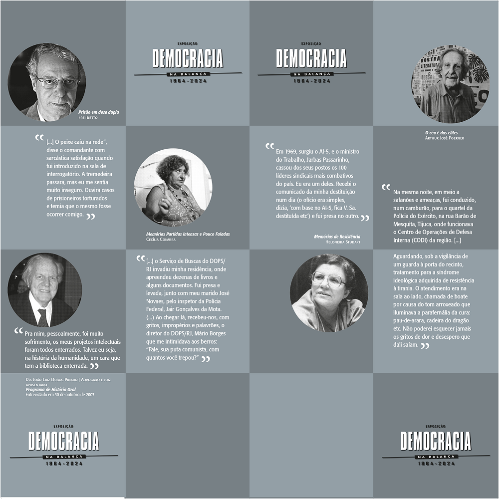 A exposição “Democracia na Balança (1964–2024)”, realizada em parceria com o Programa de Pós-Graduação em História da Universidade Salgado de Oliveira, tem como objetivo apresentar os inúmeros desafios enfrentados na construção e na manutenção da democracia no Brasil. Com um recorte especialmente pertinente, articula os 60 anos do golpe civil-militar de 1964 aos recentes acontecimentos de 8 de janeiro de 2023 — eventos que evidenciam a constante fragilidade da democracia brasileira.