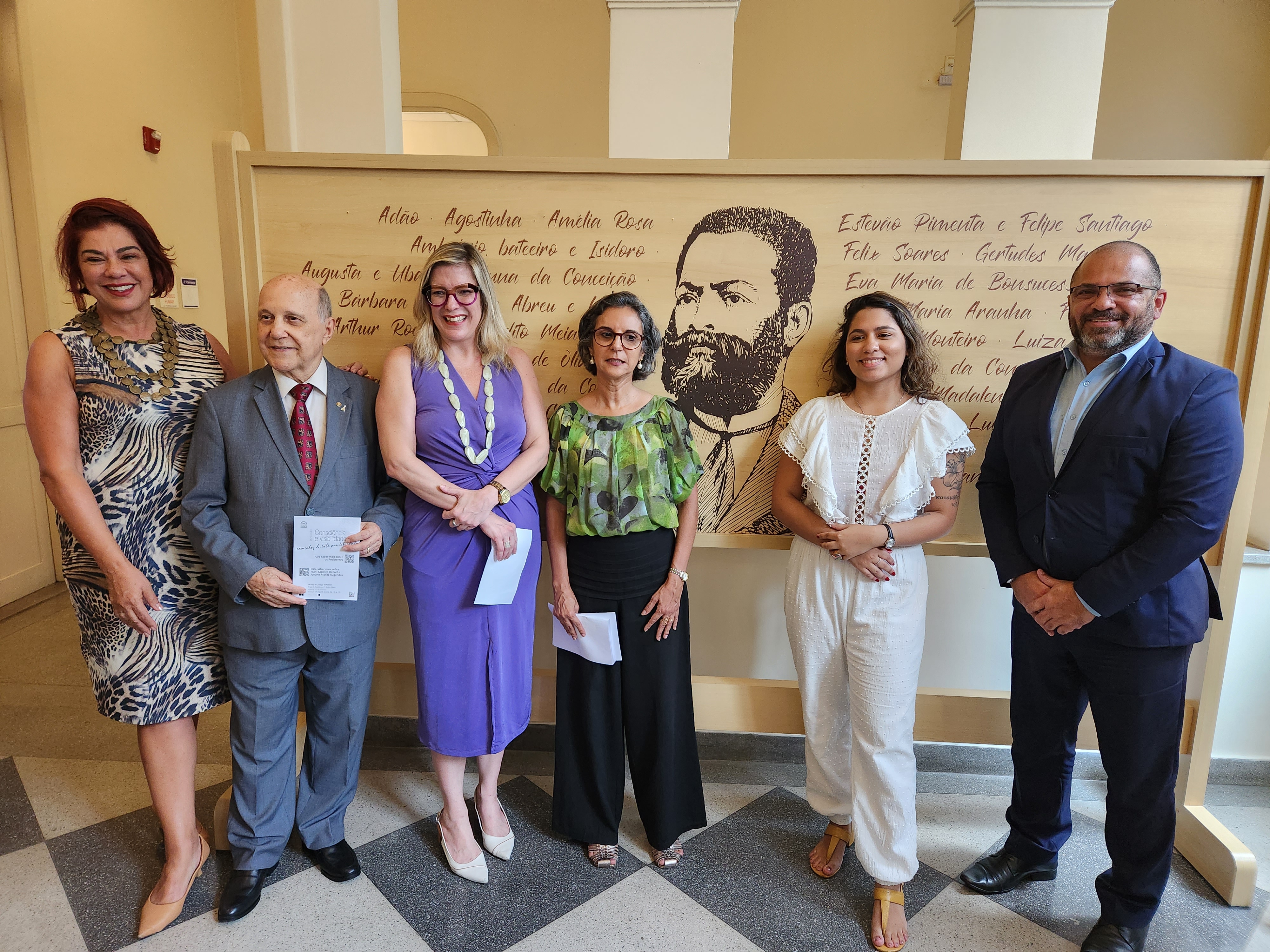 Nesta segunda-feira (13/11), foi realizada, no Museu da Justiça de Niterói, a cerimônia de inauguração da exposição “Consciência e visibilidade: caminhos de luta por liberdade”, idealizada em parceria com o Programa de Pós-Graduação em História da Universidade Salgado de Oliveira (PPGH). Estiveram presentes na solenidade: o Desembargador Roberto Guimarães, Presidente da Comissão de Preservação da Memória Judiciária (COMEMO); Anderson Freire, Diretor-Geral da UNIVERSO-Niterói; Profa. Dra. Marcia Amantino (PPGH/UNIVERSO); Ana Paula Delgado, Diretora do Departamento de Gestão e Disseminação do Conhecimento; e Siléa Macieira, Diretora do Museu da Justiça.