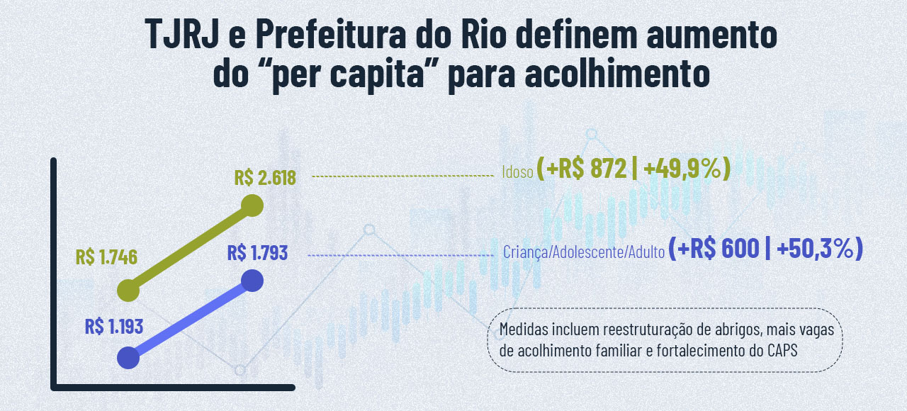 O encontro teve como objetivo apresentar aos representantes do município as principais pautas da Cevij e buscar soluções para os problemas levantados. O tema mais relevante do encontro, que era o pedido de aumento do valor pago pela Prefeitura do Rio pela “per capita” para as instituições de acolhimento, foi acolhido. O valor “per capita” recebido pelos abrigos era de R$ 1.193 por criança, adolescente ou adulto. O valor agora passa a ser de R$ 1.793. Já o valor por idoso, que era de R$ 1.746 sobe para R$ 2.618.